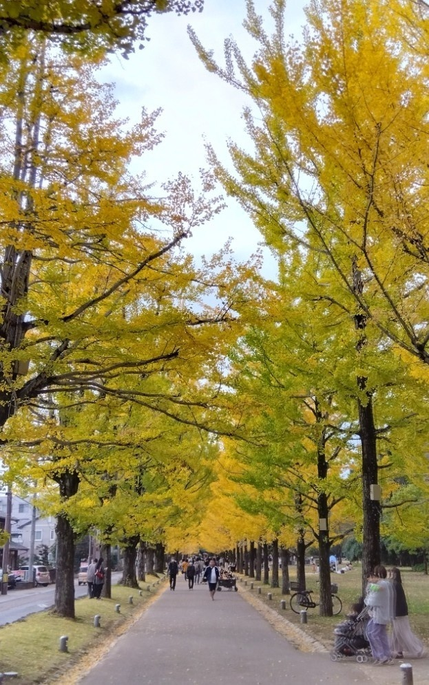 散歩コースの銀杏並木。ここは観光スポットになっているようで朝早くからたくさんの人が訪れています。ウェディング用の写真撮影も。花嫁の純白のウェディングドレスが朝日に輝いて眩しかったです。ファッションモデルらしき女性の撮影もしていました。日ごとに朝の冷えこみが厳しくなり秋が一層深って来たのを感じます。