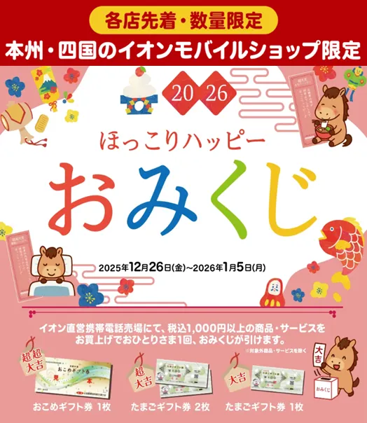 ただいまイオン直営携帯電話売場では、2026年1月5日(月)までの期間、「ほっこりハッピーおみくじ」 を実施しています🎉