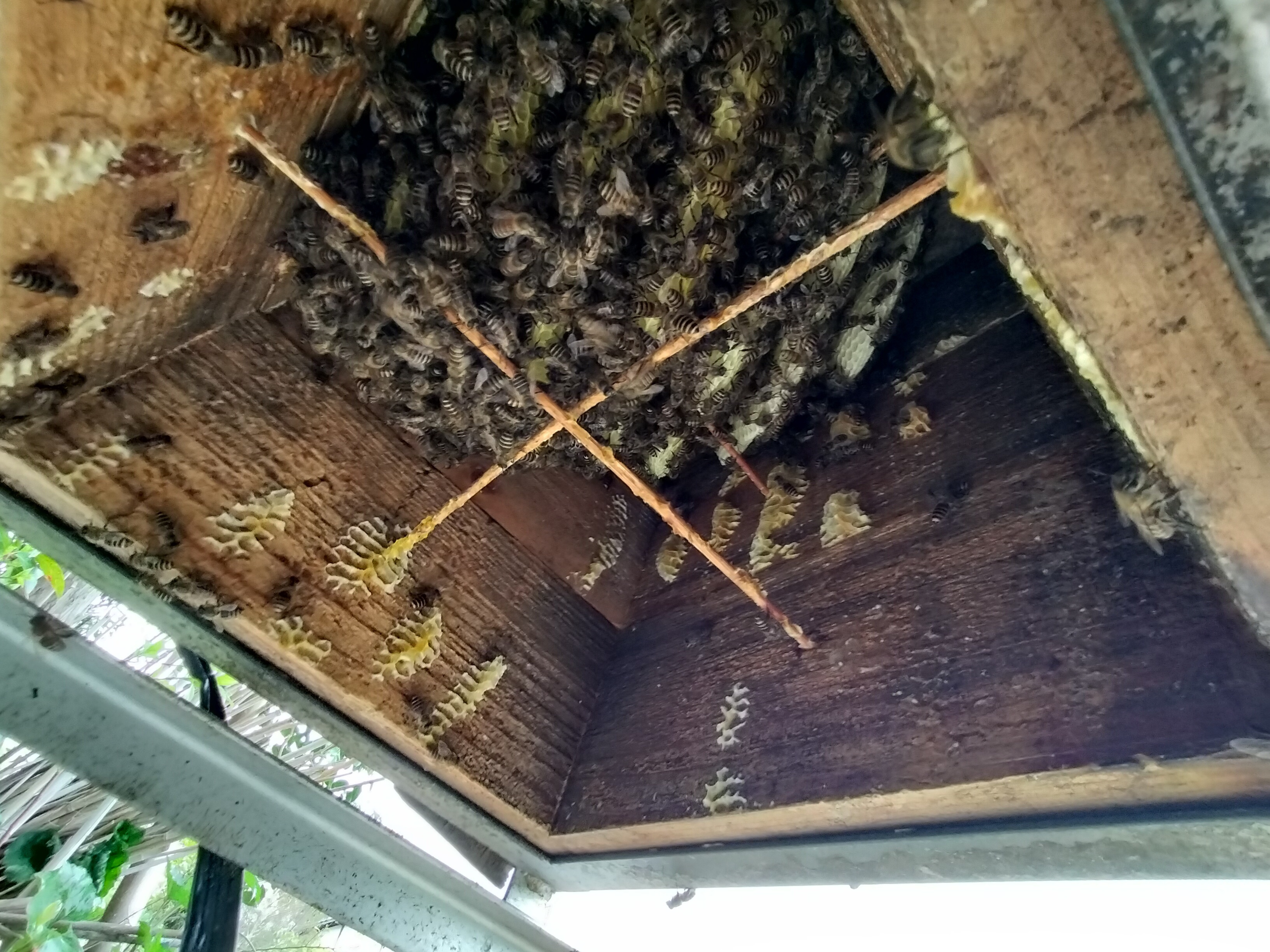 トップ > スマホで写真 > ペット > 3月24日の強制入居群 よし 利用経験あり 2026/04/13 09:52 3月24日の強制入居群 3月24日に横浜から帰省していた息子が、虫網で捕まえて強制捕獲したミツバチですが、順調に巣が伸びてきてます。 母親の嬢王蜂だったかは不明ですが、めすのワーカ(働き蜂)も増えているようなので、受精卵を産んでいるんだと思います。 この時期のワーカーの命は1カ月程度。分蜂の時に嬢王蜂と一緒にやってきたワーカはすでに死んでしまっているかもしれません。 ニホンミツバチ 働き蜂 ワーカー いいね 共有する 共有する X facebook LINE リンクをコピー コメントする 1 件の返信 (新着順) ミュートしたユーザーの投稿です。 投稿を表示 義娘 利用経験あり 2026/04/13 15:21 逆さま?じゃあないんですよね? いいね 返信する ミュートしたユーザーの投稿です。 投稿を表示 よし 利用経験あり 2026/04/13 16:38 義娘 底蓋を外して下からのぞいてます。よく見られてる、西洋ミツバチの枠式の巣箱だと上蓋外して、巣枠(枠の中に蜂蜜のつまった巣がある)を取り出したりしてると思います。ニホンミツバチだと、天井から巣が伸びてきているようなイメージです。上から、ミツ、花粉、育児室と並んでます。 巣が大きくなると、上のミツがたまった部分を切って採蜜します。 いいね 返信する