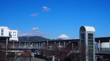 NEW 富士山見えますか?132 JR清水駅東口連絡通路からなら、正面に見ることができます。「河岸の市」で買い物や食事を終えた観光客がたくさん記念撮影をしています。