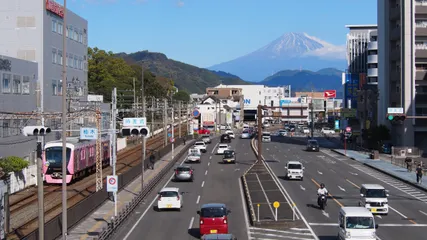 国道1号線を東進中、富士市から沼津市に入った付近の助手席からの眺めです。雲に姿を隠しているかのように見えませんか?