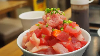 NEW 富士山見えますか?(笑) 清水「河岸の市」でのランチに「おまかせ定食」を選びました。この盛り方が独立峰に見えませんか?さて、酢飯にマグロとサケの山盛りとカジキの煮物と味噌汁で大満足ランチでした。