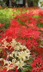 彼岸花 散歩の途中に彼岸花の群生に遭遇しました。燃えるような情熱の赤と清廉な白。そのコントラストの美しさ。別名、曼珠沙華。天上(あの世)の花という意味だそうです。花、葉、茎、 根とすべてに毒があるので、口にすればあの世に逝 ってしまう、ということなのでしょうか。くれぐれもお気を付け下さい。