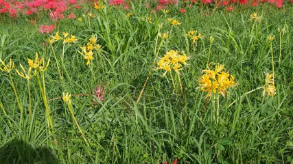 黄色の彼岸花? 半田市の矢勝川の土手には彼岸花がたくさん咲いています。所々に白の固まりも見付けられます。最後に(写真の)黄色の集団も見付けました。