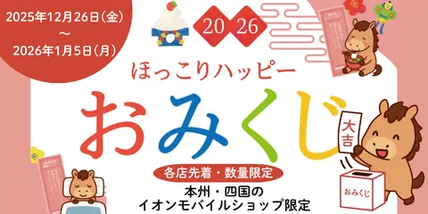店舗限定『ほっこりハッピーおみくじ🫶』開催!🐎✨ こんにちは、イオンモバイルひろば事務局です😊ただいまイオン直営携帯電話売場では、2026年1月5日(月)までの期間、「ほっこりハッピーおみくじ」 を実施しています🎉税込1,000円以上の商品・サービスをお買上げの方が対象でその場でおみくじが1回引けます💌✨🎍景品内容🎁 超超大吉:おこめギフト券 1枚