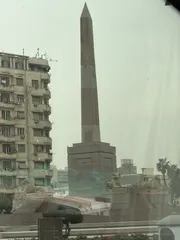 ラムセス2世のオベリスク サニス(タニス)から移設されたラムセス2世のオベリスクで、その周囲をカルナック神殿から運ばれた4体の雄羊の頭を持つスフィンクスが囲んでいます。背後に見えている建物は、広場に面したアパートやオフィスビルです。この広場は、エジプト博物館のすぐ近くに位置しています。