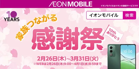 🎉 10周年キャンペーン開催中!こんにちは、イオンモバイルひろば事務局です😊10周年YEARでは、さまざまな企画やキャンペーンを実施中!現在開催中の🌸 家族つながる感謝祭 🌸 では、対象スマホが特別価格となっています!本体だけのご購入ももちろん特別価格なので、機種変更もぜひご検討ください😆✨また、お