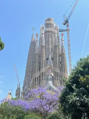 サグラダファミリア5月の一時期だけが「ジャガランダ」の花が満開に。 空の青 植林の緑 ジャガランダの紫工事の塔も一緒にサグラダファミリアが最高です。日本の🌸