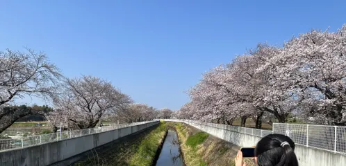 桜と新中学生 近所の桜並木。下の娘が春から中学進学です。中学校の制服着て、桜の下で記念撮影。入学式までは桜がもたないので、いつも前撮りです。子供たちが通った保育園の近くでもあり、この場所はいろんな思い出の場所でもあります。小さい時は遠くに見えた桜も目の前に。大きかった保育園も小さく見え。川をみるのも大変だった柵も