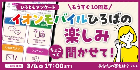 【回答募集中|3月4日17時まで】10周年の節目!イオンモバイルひろばで楽しみにしていることは何ですか?✨ ひろとものみなさま、こんにちは!いつも「イオンモバイルひろば」をご利用いただき、本当にありがとうございます✨😊おかげさまで、イオンモバイルはもうすぐ10周年という大きな節目の1年を迎えようとしています🎉これまで支えてくださったみなさまへ、ひろばスタッフ一同、心より感謝の気持ちでいっぱいです。誠にあり