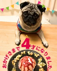 🎉🎂 Happy 4th Birthday 🐾 パグさん、4才になりました🎉🐾 ちょっと緊張気味なお顔も「早く食べたい…」が出てるところも全部かわいいです😍 4才も元気に笑顔いっぱいの一年になりますように🍀
